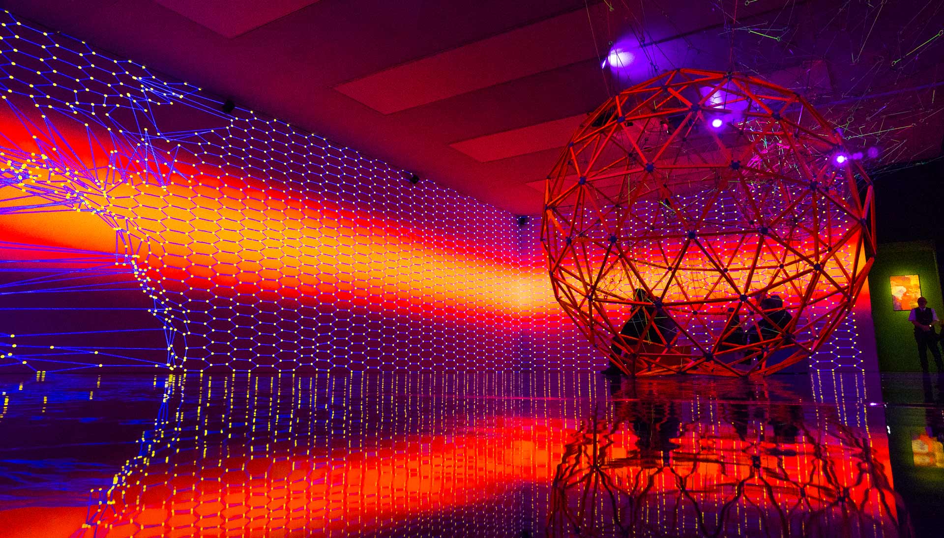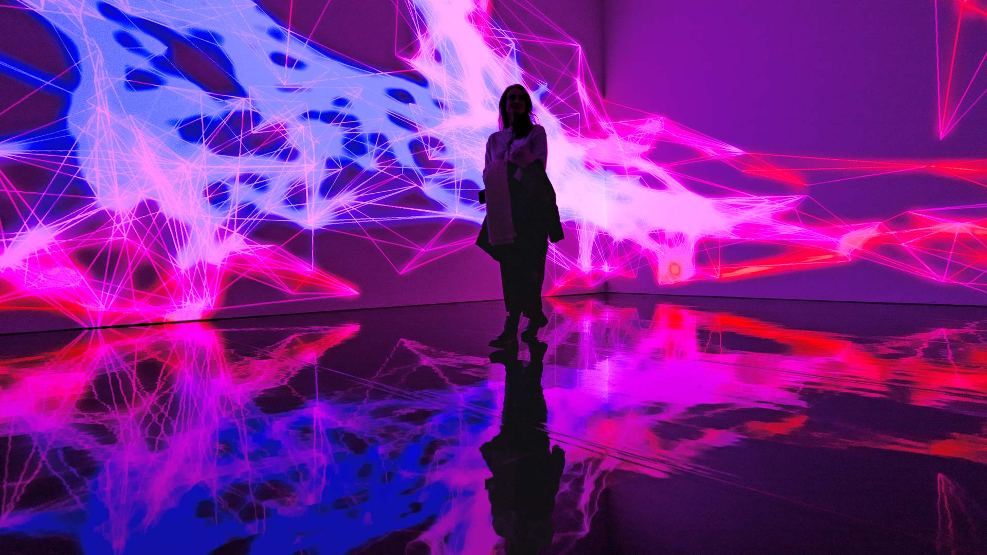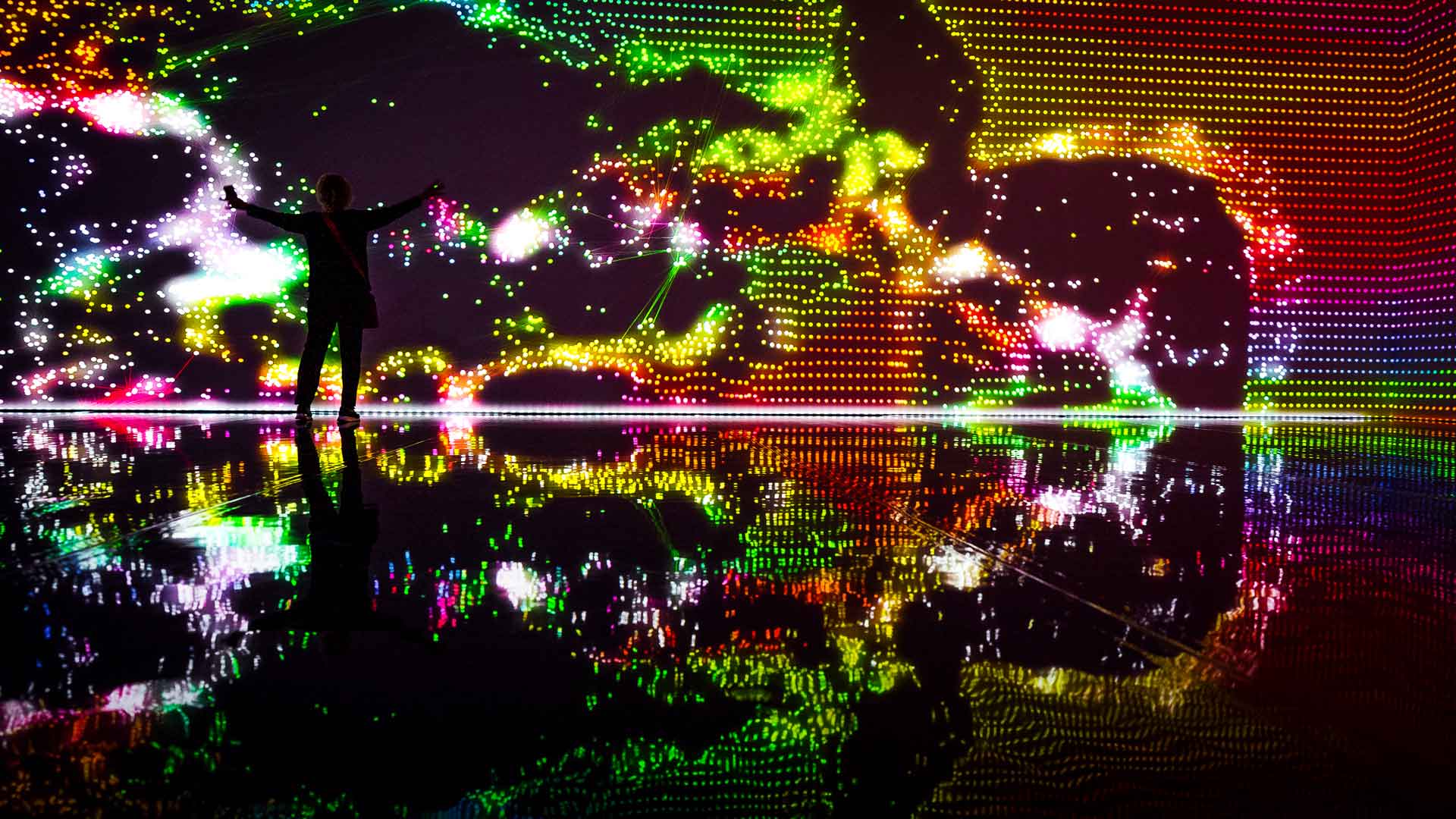 In dunklen Räumen entfalten sich seine Werke. Algorithmen reagieren auf Bewegung. Licht und Farbe tanzen miteinander. Der Dialog zwischen einem digitalem Kunstwerk und Publikum wird zur einer erlebbaren Erfahrung.